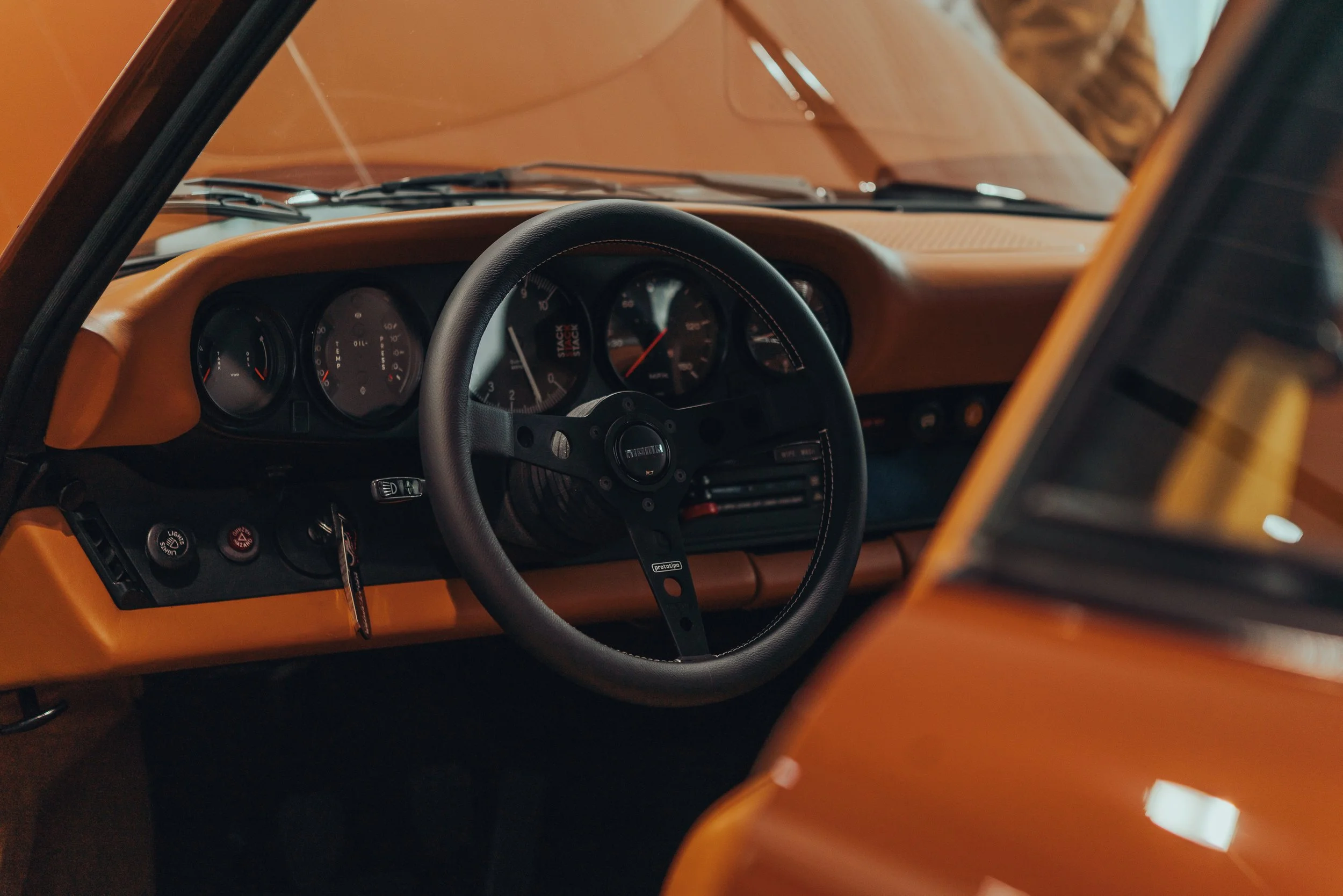This 1975 Porsche 911 Carrera "R-Gruppe," built by Kelly Moss Road & Race, recently joined our collection and is perhaps one of the most uniquely exquisite cars to ever roll into our showroom. The color is known as Cockney Brown, and it pairs beautifully with its gold graphics and matching magnesium BBS E88 wheels. A restomodded interior with Cognac leather, a Momo Italia steering wheel, STACK instrumentation, a lightweight shift knob, and several other subtle components complete this classic & contemporary Carrera RS tribute. More details can be found in the video below.